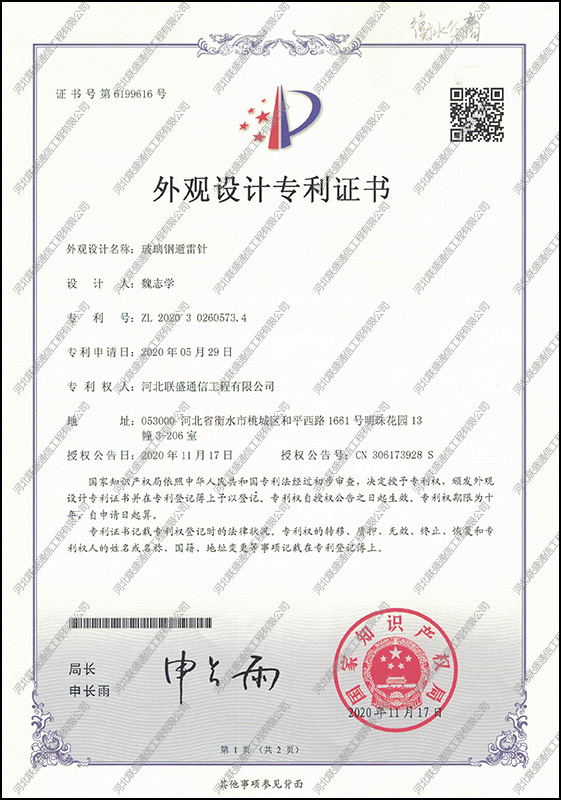 玻璃鋼避雷針外觀設計專利證書